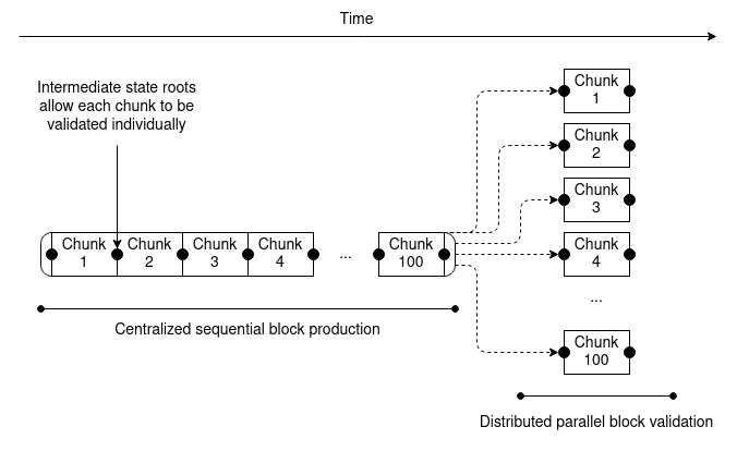 - Add a second tier of staking, with low resource requirements, to do distributed block validation.The transactions in a block are split into 100 buckets, with a Merkle or Verkle tree state root after each bucket. Each second-tier staker gets randomly assigned to one of the buckets. A block is only accepted when at least 2/3 of the validators assigned to each bucket sign off on it.