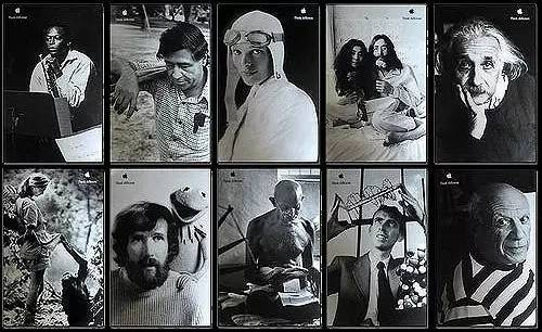 Steve Jobs came up with 'Think Different' and selected icons from various fields of thought who broke the mould, such as Albert Einstein, Hitchcock, Bob Dylan, Martin Luther King, John Lennon, Chaplin, Picasso, Gandhi, Thomas Edison and many more, and put their large black and white portraits in print ads with the Apple logo and tagline in the corner Think Different, with no explanatory text beyond that.