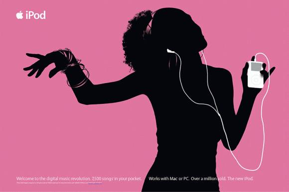 Apple's iPod ad, for example, doesn't showcase a product, it creates an icon; in this 2003 ad, two-dimensional silhouettes of human figures dance against a brightly coloured background; there are no photos of the product in the ad, and the iPod and headphones appear in silhouette. Apple does not ask the viewer to buy the product, but only to identify with the emotion of the ad.